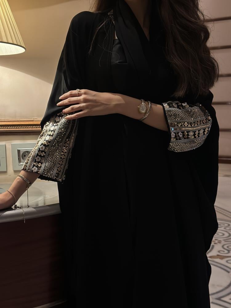 مواصفات العباية : ملكي صيفي تطريز شك على الاكمام وطرف الطرحه نوع المنتج: عباية صيفي تصنيف المنتج: صيفيالقصة: نص بشت ( فراشه)القماش: ملكياللون: اسود تطريز شك الطرحه: شامله طرحه تطريزبلد الصنع: السعودية