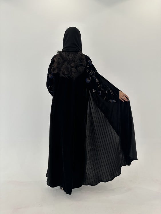 وصف العبايه /عبايه شتويه مخمل تطريز اكماموكسرة من الجوانبمقفله بطقطقنوع القماش / مخمل مع كسرات راماشامله طرحه تطريز .